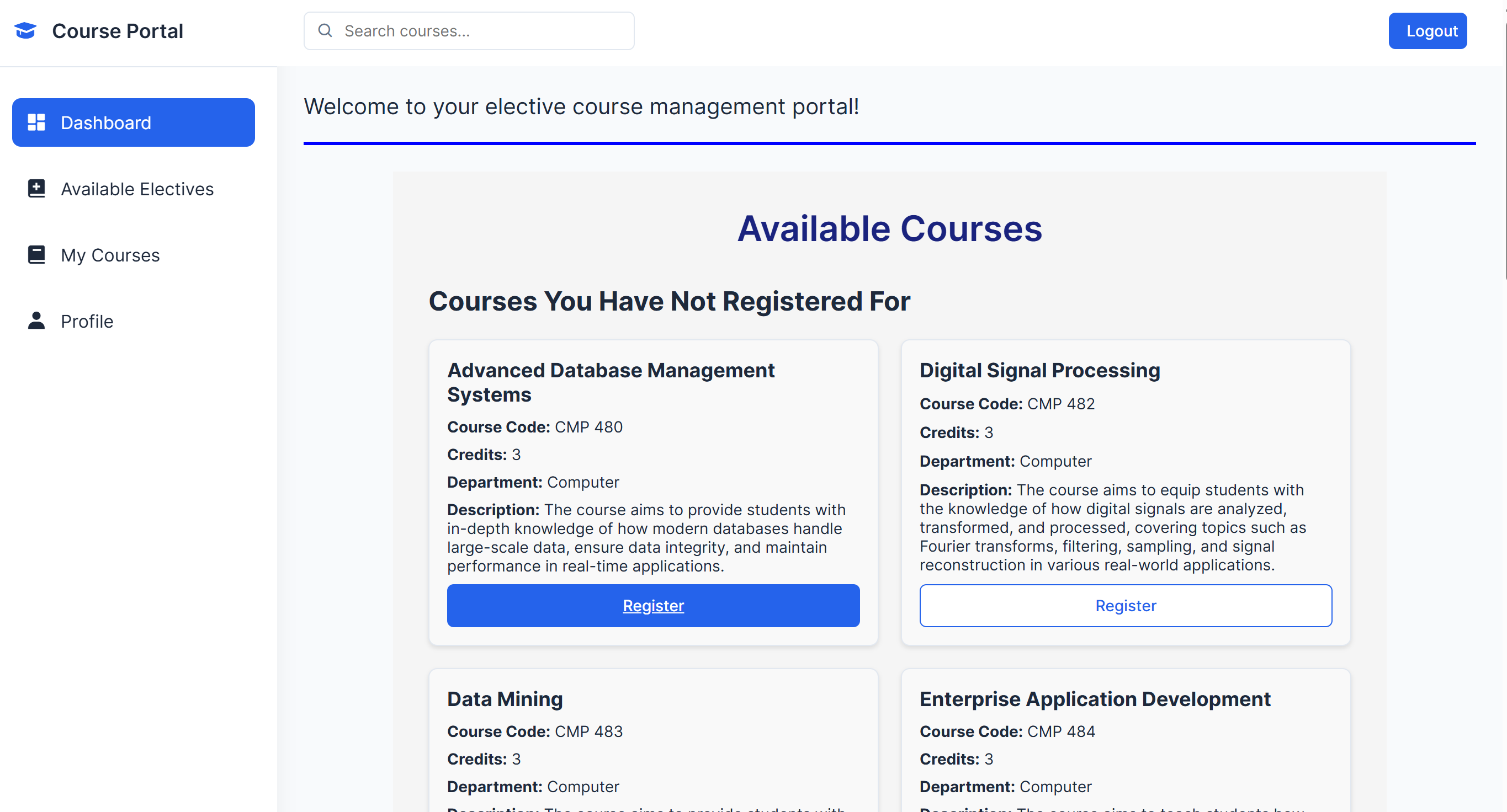 CourseSelect is an elective course registration system designed for BCT students at IOE Campus as part of a DBMS project. Built with MySQL, the system enables efficient course selection, enrollment, and management. It simplifies the registration process, ensuring smooth and organized handling of elective courses for students.